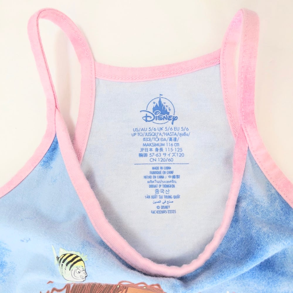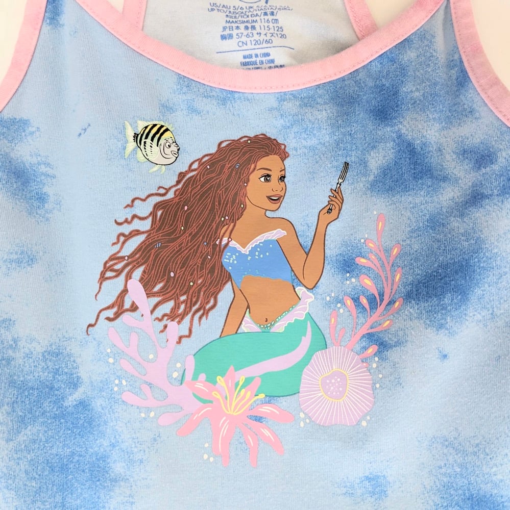 Disney girls size 5/6 sleeveless,/spaghetti strap jersey knit, multicolour tie-dye design dress with a tiered skirt bottom and inset pockets is inspired by Disney's live action film The Little Mermaid and is certain to make a splash at school or play featuring Ariel and Flounder screen art on chest. 95% cotton/5% elastane. Gently Loved. Great Condition.