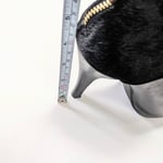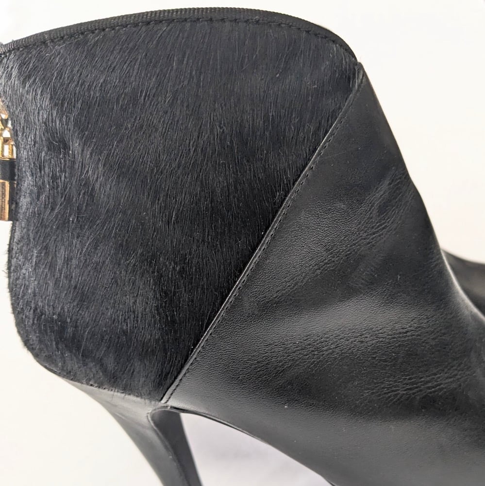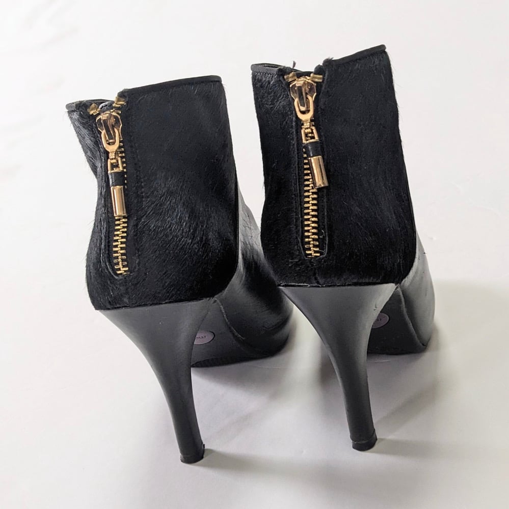 Elevate your wardrobe with these size 7.5M chic black leather, cow hair contrast platform ankle boots with metal zip gold tone closure accented with a beautiful cylinder shape gold tone & leather trim zipper pull.