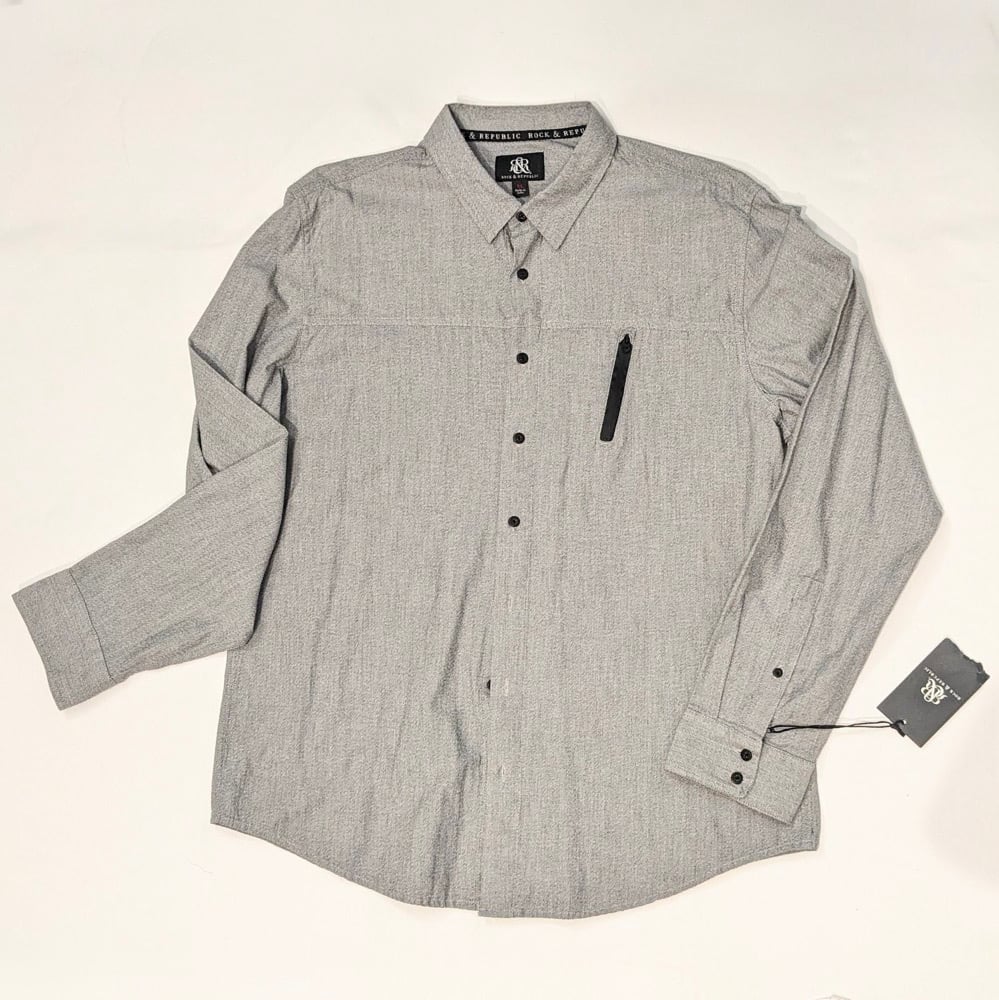 This Rock & Republic Men's Gray Button Down Collared Long Sleeve Shirt in size XL is a versatile and stylish addition to any man's wardrobe. Made from a comfortable cotton blend fabric, this shirt features a classic point collar, roll-tab sleeves, and a chest zipper pocket for added detail. Perfect for various occasions including casual wear, workwear, and parties, this shirt is easy to care for with machine washable material. With its timeless design and quality construction, this Rock & Republic shirt is a must-have for any man looking for a classic and reliable button-up option. 100% Cotton. New w/Tag.