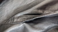 Greg Bell vintage full length leather coat with full length (50 1/4") Fox Fur Trim, fully lined, detailed stitch pattern on front, back & sleeves, full volume sleeves, inset pockets and eye hook closure. 100% Leather/100% Fox Fur. Gently Loved. Like New. Good Condition. There is a scratch on the right side pocket and a small rip at seam on the left side pocket.
