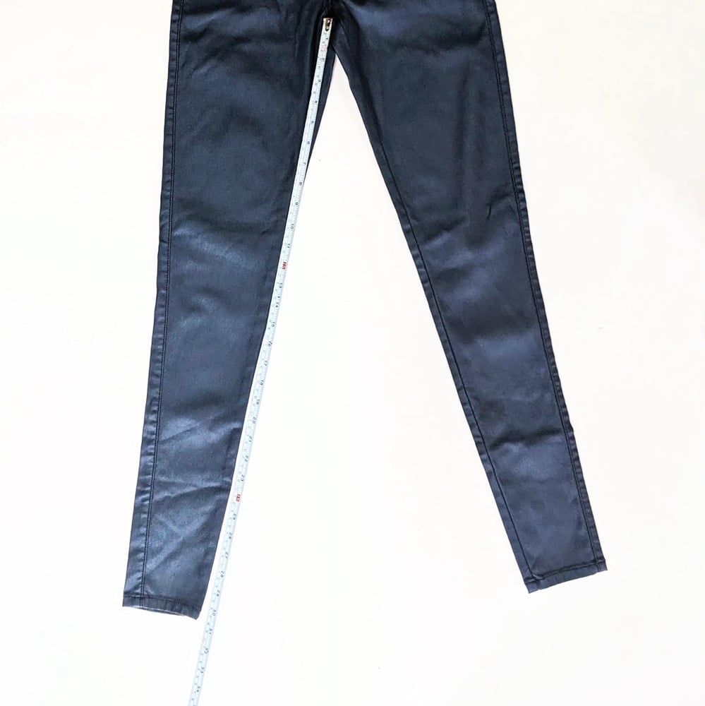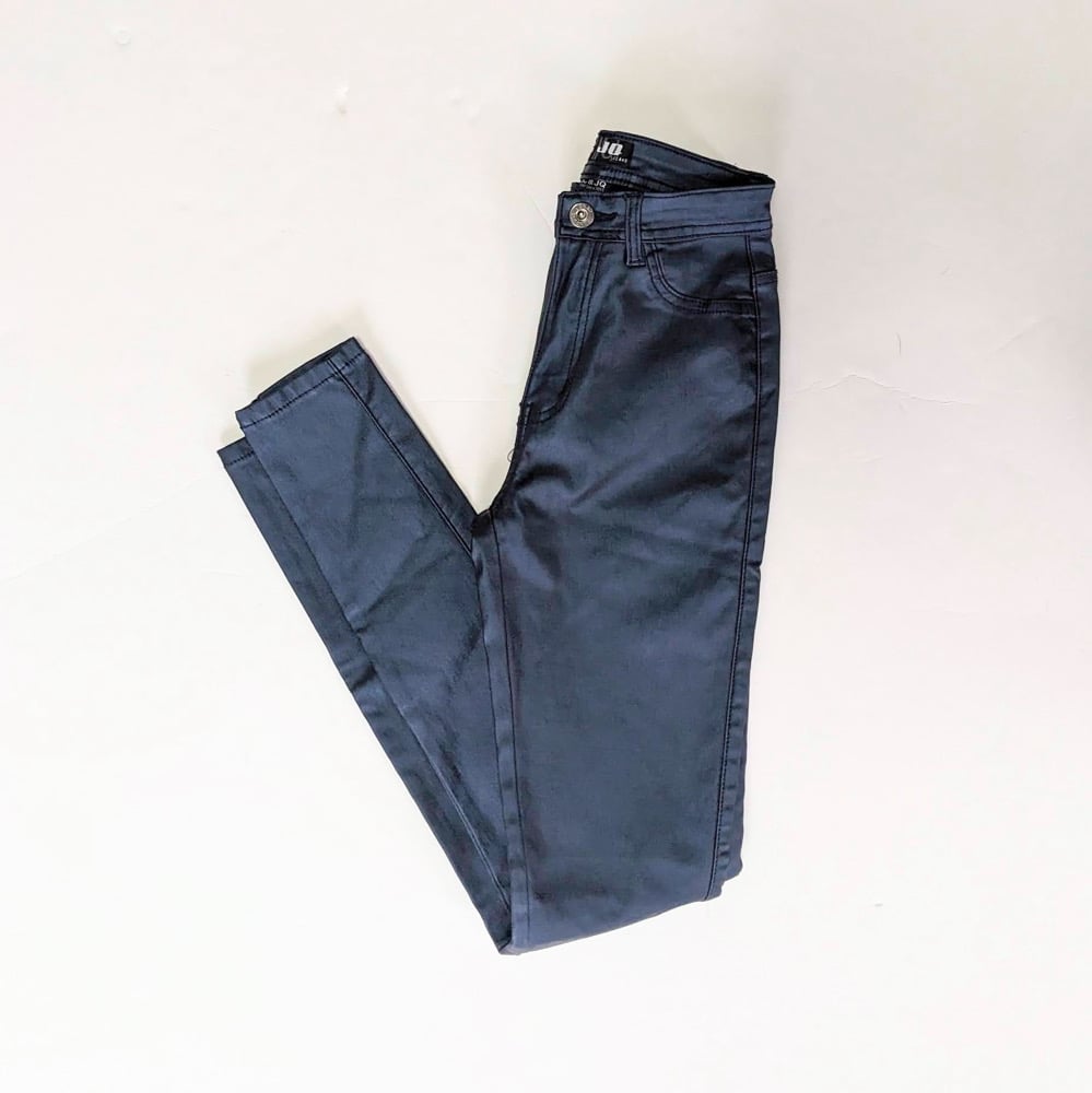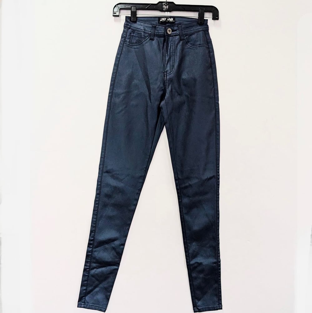 Women's size Small, midnight blue JC & JQ leather like, high rise, skinny jeans with a light shimmery coating, zipper & button closure, faux front pockets & real back pockets. Some stretch.